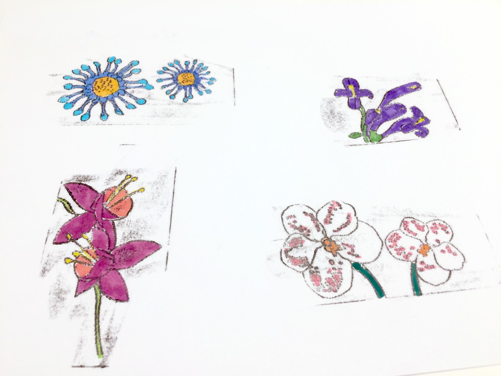 Il principio di gioco è il medesimo. All’interno della confezione ci sono otto tessere con fiori differenti da utilizzare con la tecnica del frottage.